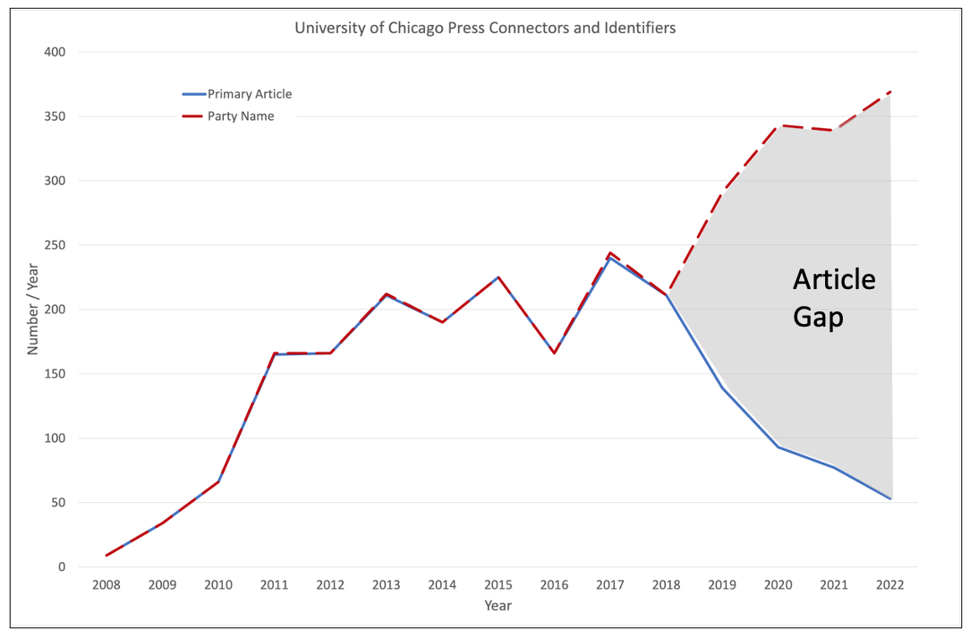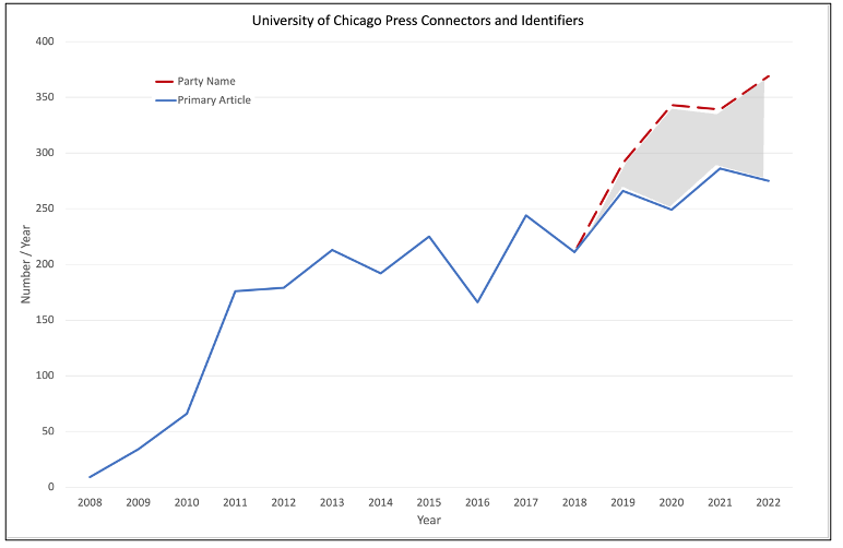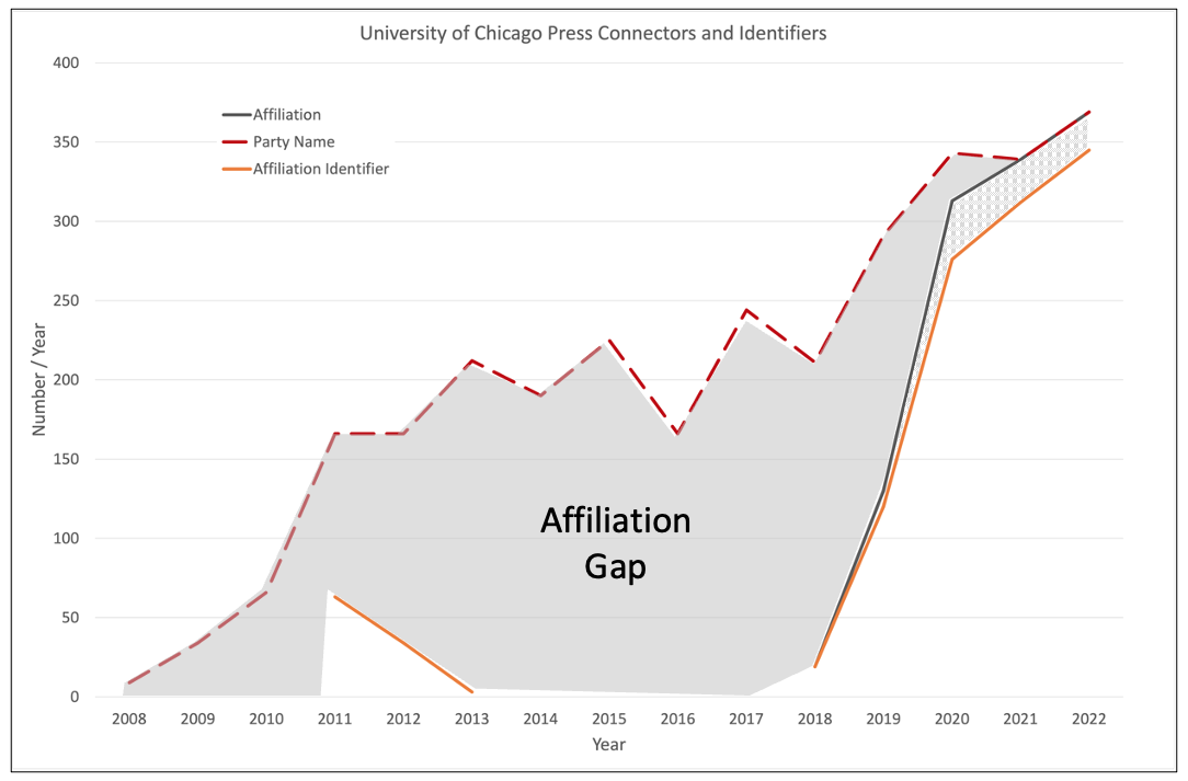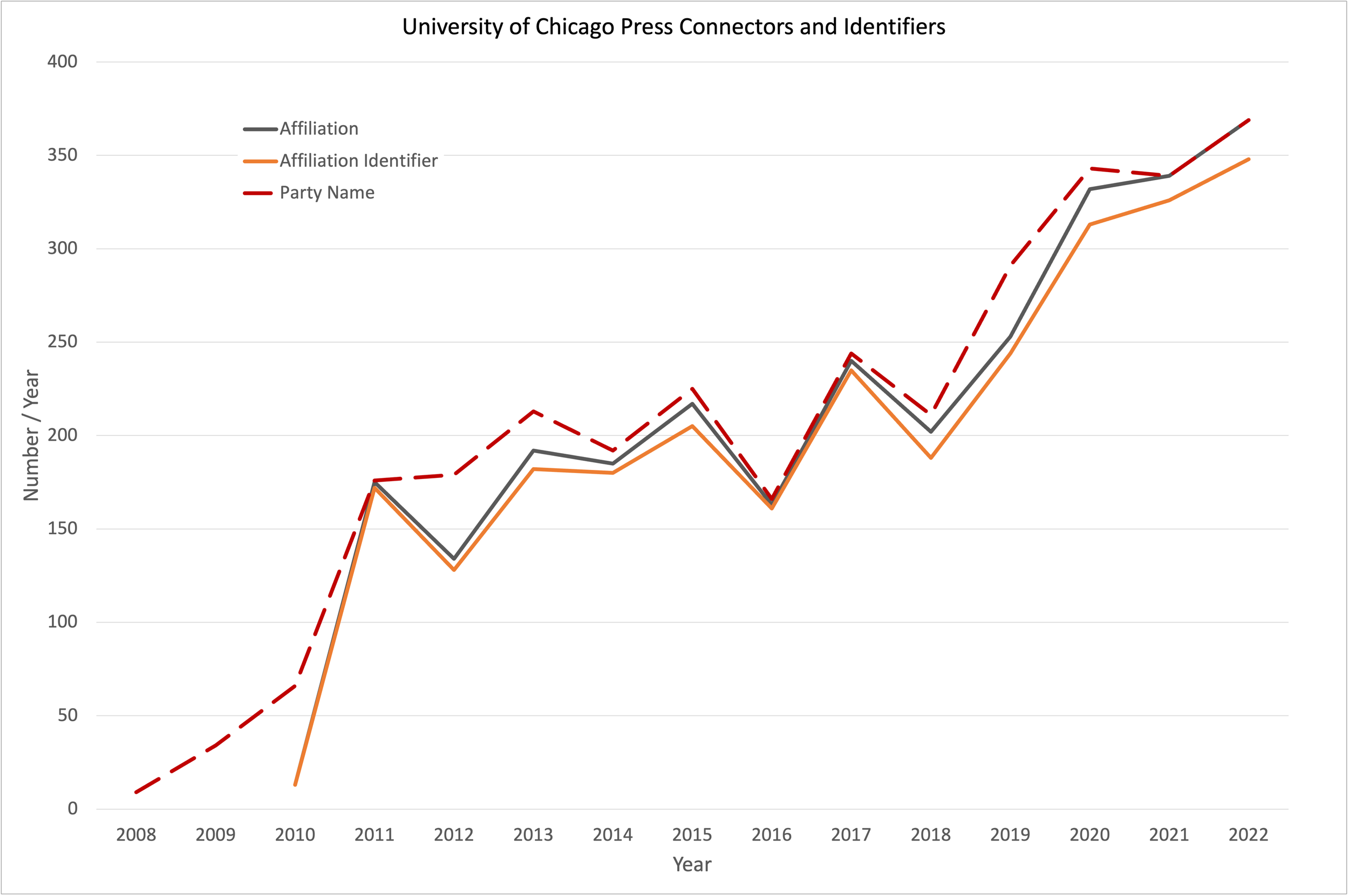 Currently, the entire University of Chicago Press collection includes 453 unique affiliations that are used 1253 times. The second connectivity improvement task was to find affiliations and identifiers for the parties that were missing them.