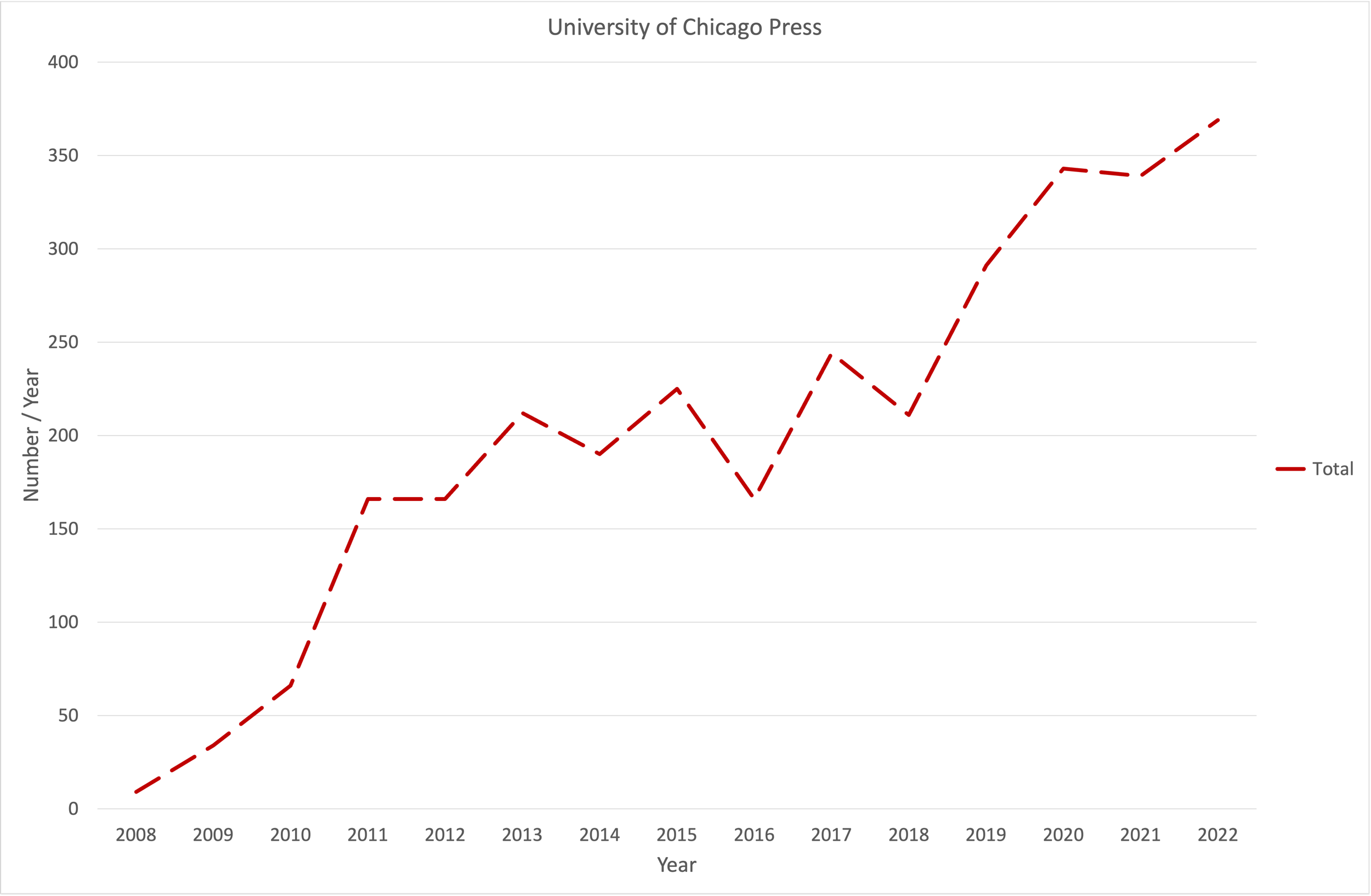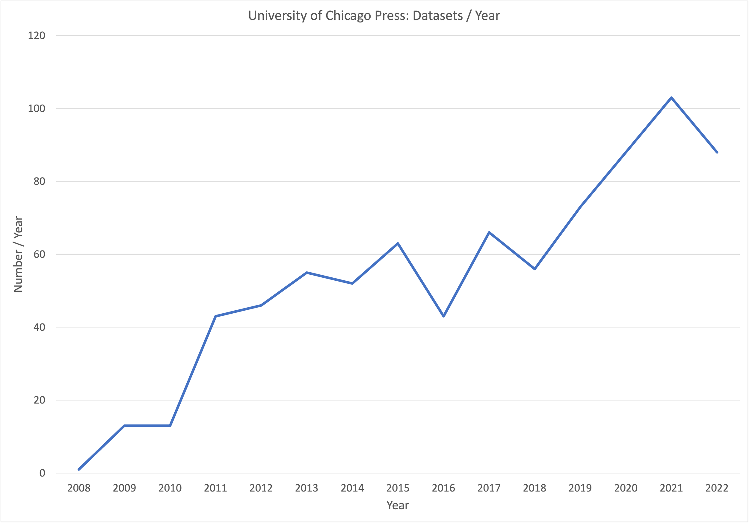Three journals published by the University of Chicago Press have associated datasets in Dryad (The American Naturalist (782 datasets), Physiological and Biochemical Zoology (13), and International Journal of Plant Sciences (8)). The number of datasets submitted each year has grown steadily since 2008 (Figure 1), with a surge since 2019.