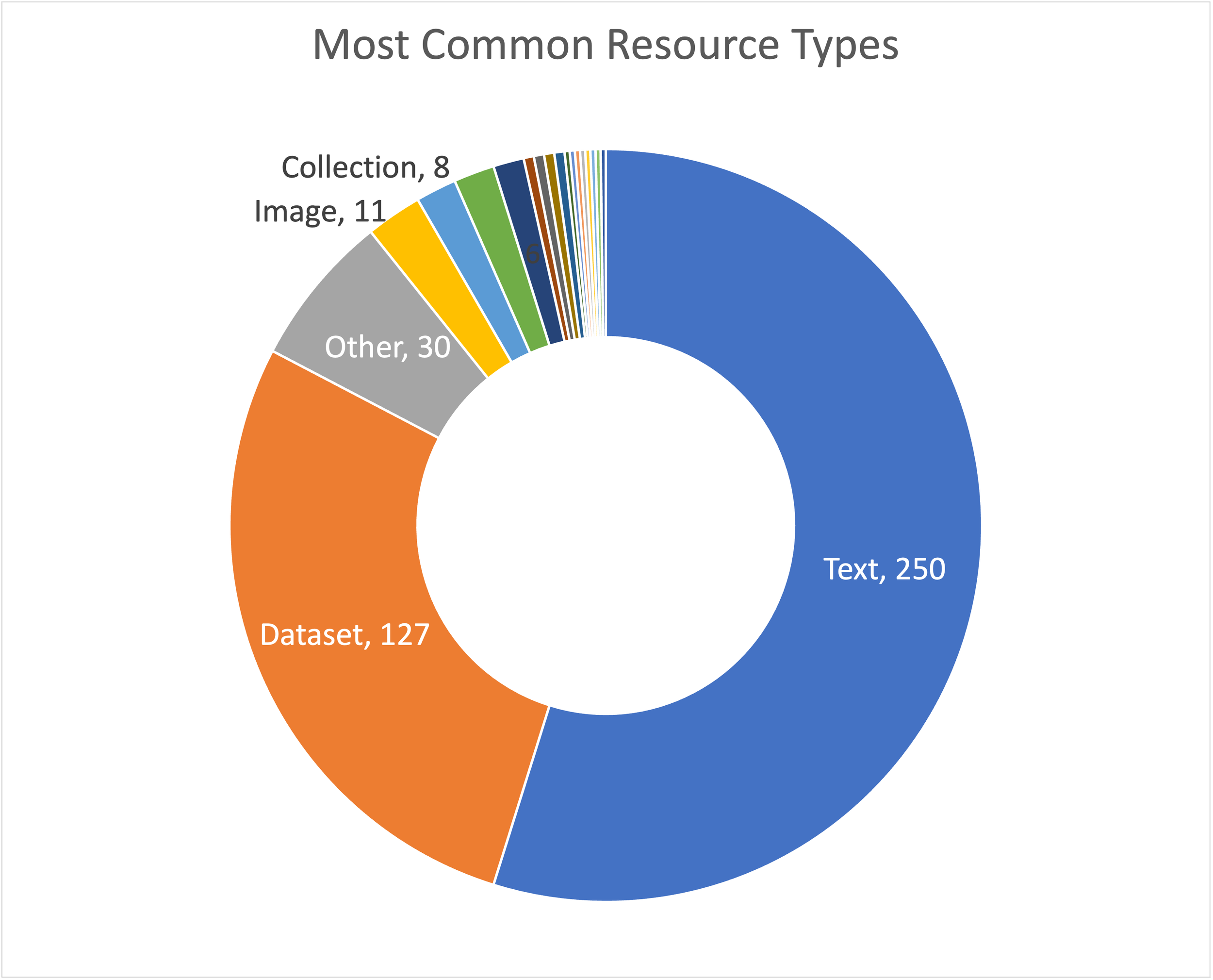 It is not uncommon to think about DataCite as the place where members register datasets for DOIs. Recent work reminded me that DataCite is also used to register DOIs for many other resourceTypes. In particular, “Text” resources are very common in DataCite and have outnumbered Datasets overall in many recent years. Figure 1 shows the distribution of resourceTypes in the University Repositories. Text resources clearly dominate the University Repositories. They make up ~1.4 million of the ~3 million resources (46%) while Datasets make up 25% of the resources (nearly 800,000). As a “Data Person” this observation takes some getting used to, but “it is what it is”!