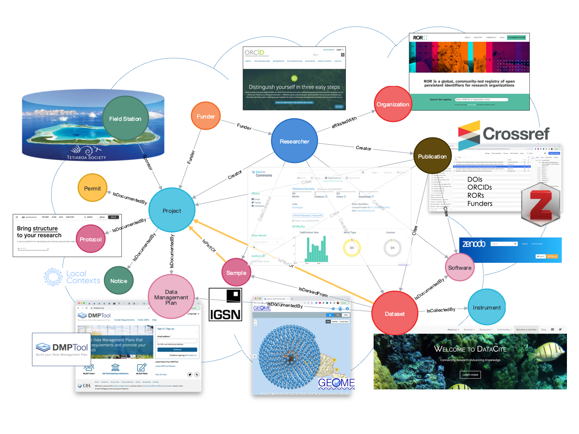 Connectivity is key. We practiced using existing infrastructure with project metadata which gave us a place to create connections to people, protocols, works, organizations, funders and facilities like biological field stations. This is not a new concept. Ted did some analysis of DataCite to show how ‘project’ had been used by groups like Center for Open Science since 2013. It was a concept that we found helpful in our work on the FAIR Island Project with field stations, many of which have applications (i.e. projects). We didn’t build any new infrastructure for this implementation. Erin used this as a core concept in a class she designed and taught at the Gump South Pacific Research Station in March. We built on work by Madison Langseth, to update the project metadata with related identifiers when things cite the project like papers, samples or Data Management Plans. From this Ted learned to create some initial graphs to begin to visualize all of these connections. Read about the FAIR Island experiments here. We presented on this at ESIP (poster, session) and AGU (poster) later this year.