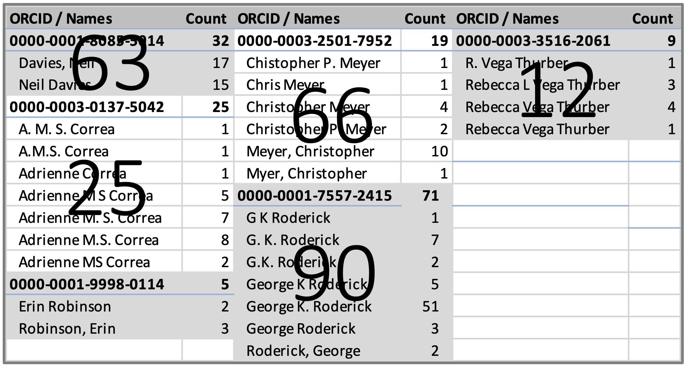 Figure 2. Multiple names for target individuals in this pilot. The large numbers are the total number of name occurrences including names without ORCIDS. Difference between these numbers and the sums in the Table are the number of missing ORCIDs.