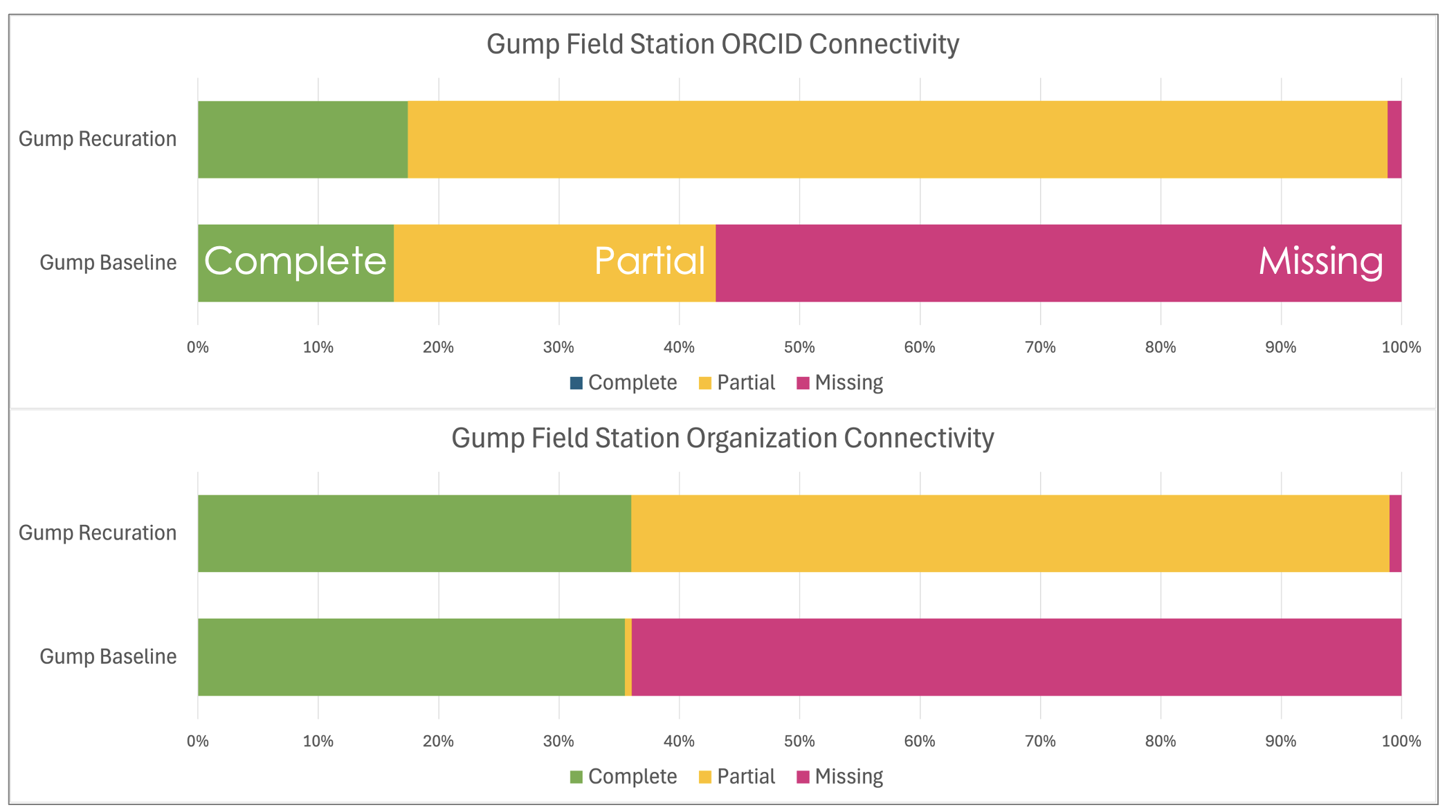 As in many communities, the Gump community includes some very active researchers that have long histories including many collaborations and contributions. A proxy corpus of research outputs from their ORCID profiles demonstrated some of the challenges related to adding identifiers to the metadata for these works, primarily multiple spellings of researcher and organization names and missing identifiers. A re-curation process standardized these names and added appropriate identifiers to the metadata. Connectivity was measured before and after this re-curation and the number of DOIs without any identifiers was decreased from ~60% to 1% for ORCIDs and RORs, leaving 99% of the DOIs in the corpus with some identifiers.