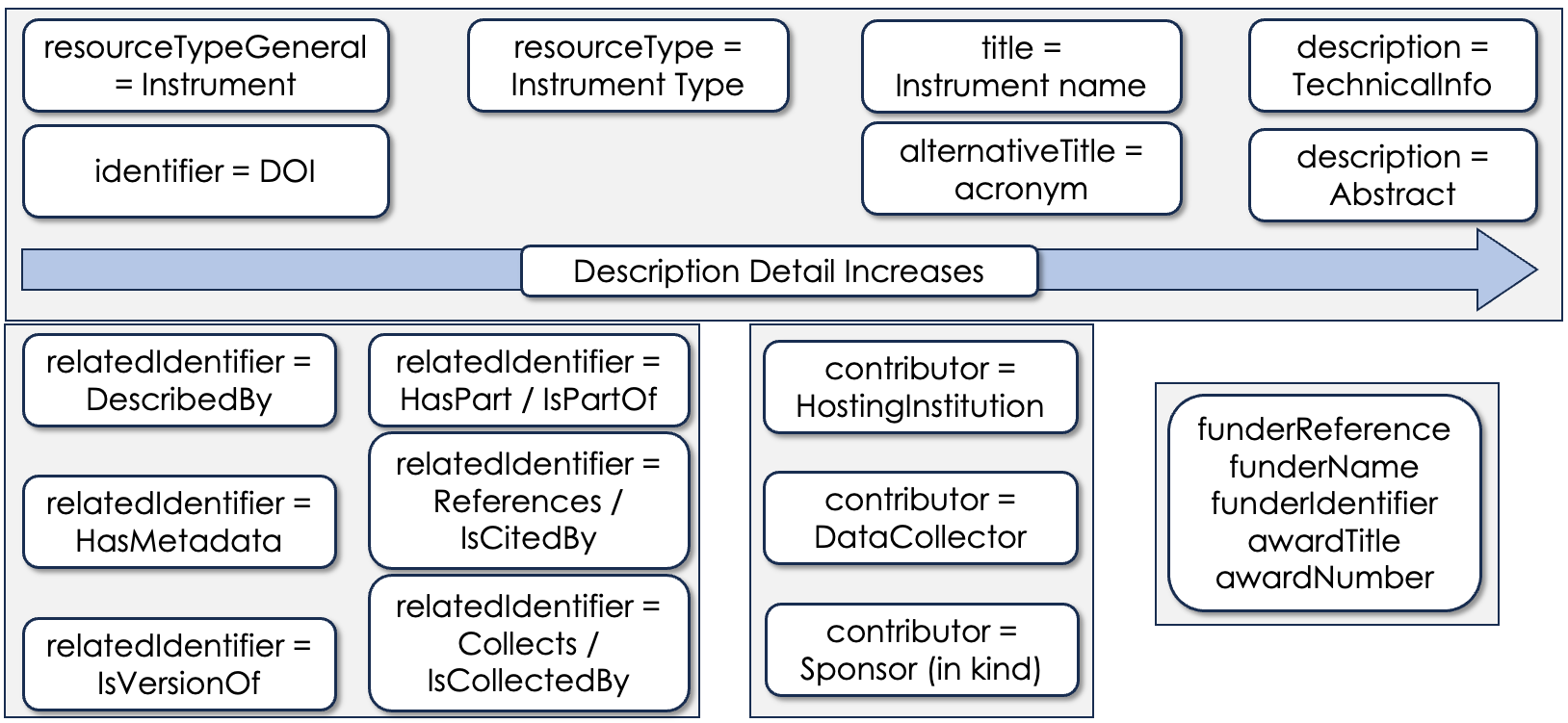 Figure 3. DataCite metadata elements that provide resource descriptions at several levels of detail (top row) and connections to identified resources, contributors, and funders (bottom row) for instruments and other resources.