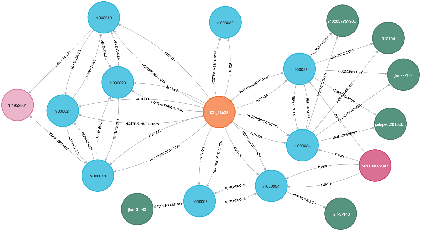 Instruments that have been used together in particular experiments are grouped into three groups by relatedIdentifiers with relationType = References. One instrument, with DOI = “ni000022” appears without any connections. Three of these instruments, in two experiments, were funded by the organization with Crossref Funder ID = 501100002347 (red). Finally, instruments are linked to articles in journals (green) or proceedings (pink) using relatedIdentifiers with relationType = “IsDescribedBy”.