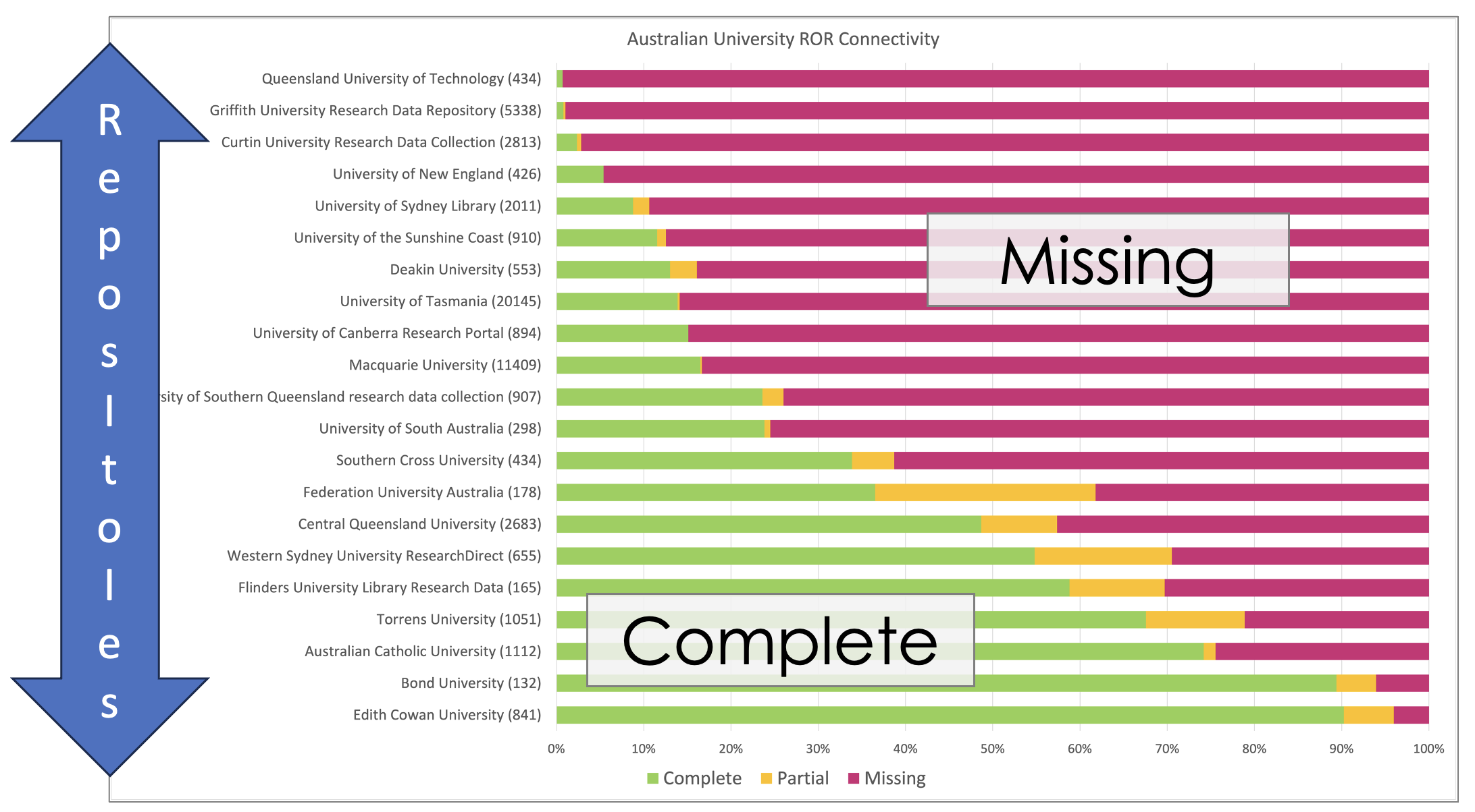 Figure 4. Creator affiliation identifier connectivity for 21 Australian universities. Repositories with more complete connectivity (Brightspots) are clear near the bottom of the plot.