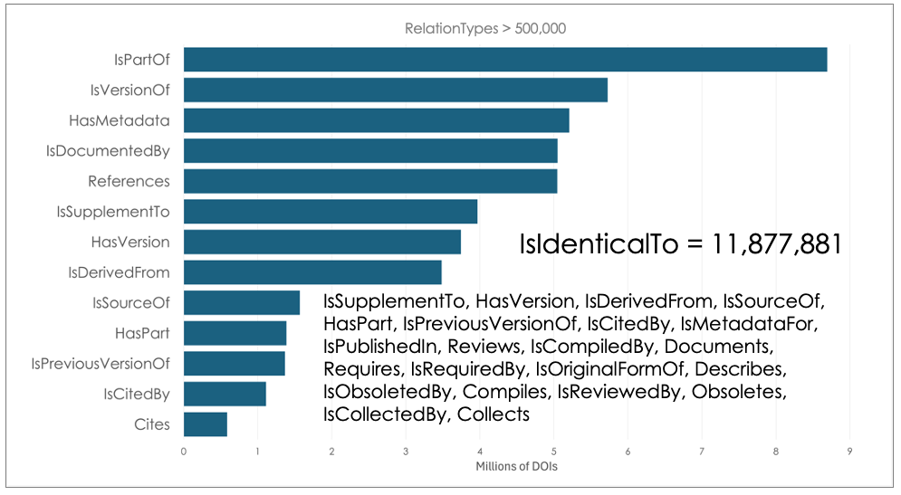 Figure 1. Number of occurrences of relationTypes in DataCite metadata repository. Those with more than 500,000 occurrences are shown. Those with < 500,000 are listed in text.