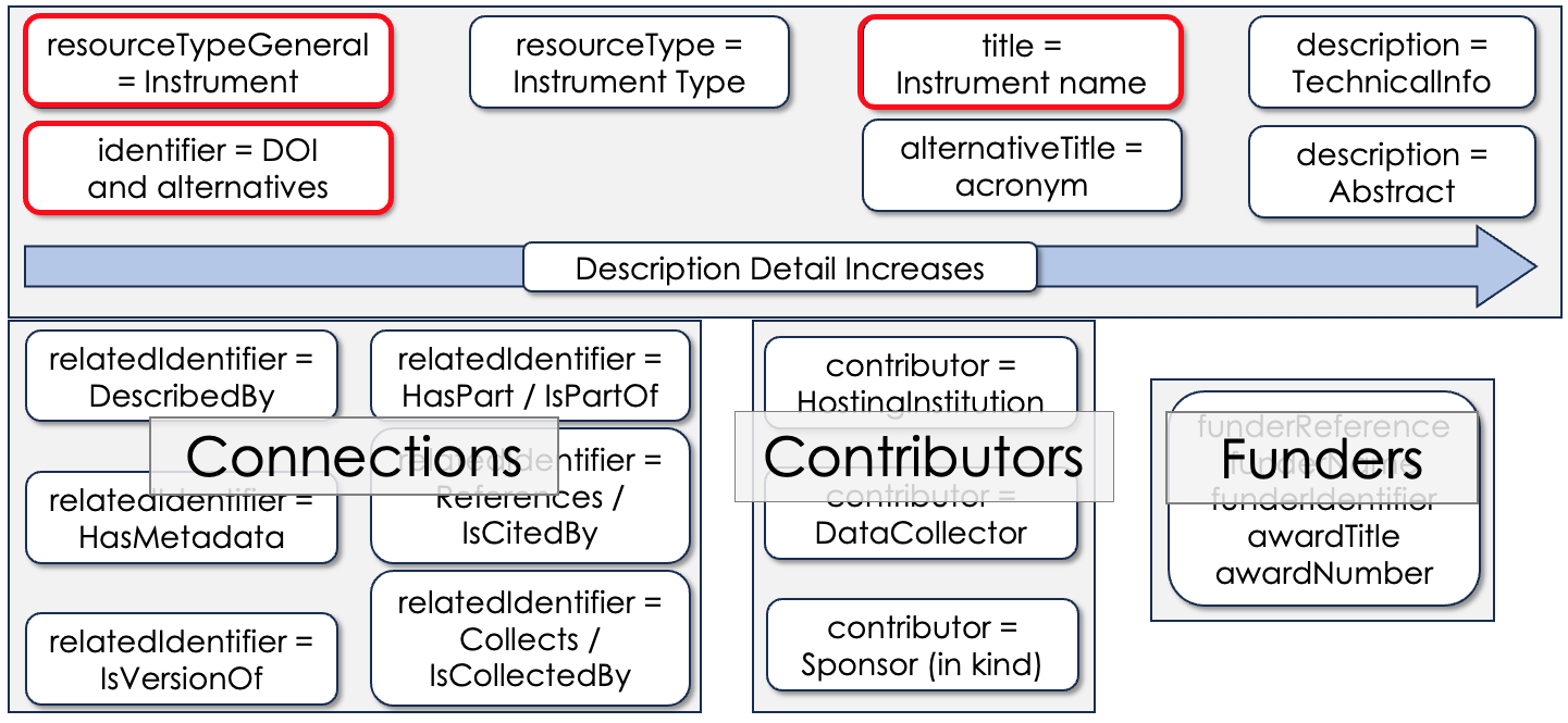 Figure 1. DataCite metadata elements provide a spectrum of detail about datasets and other resources. This example illustrates levels of detail for instrument metadata. Items marked in red are mandatory, all others are recommended or optional.