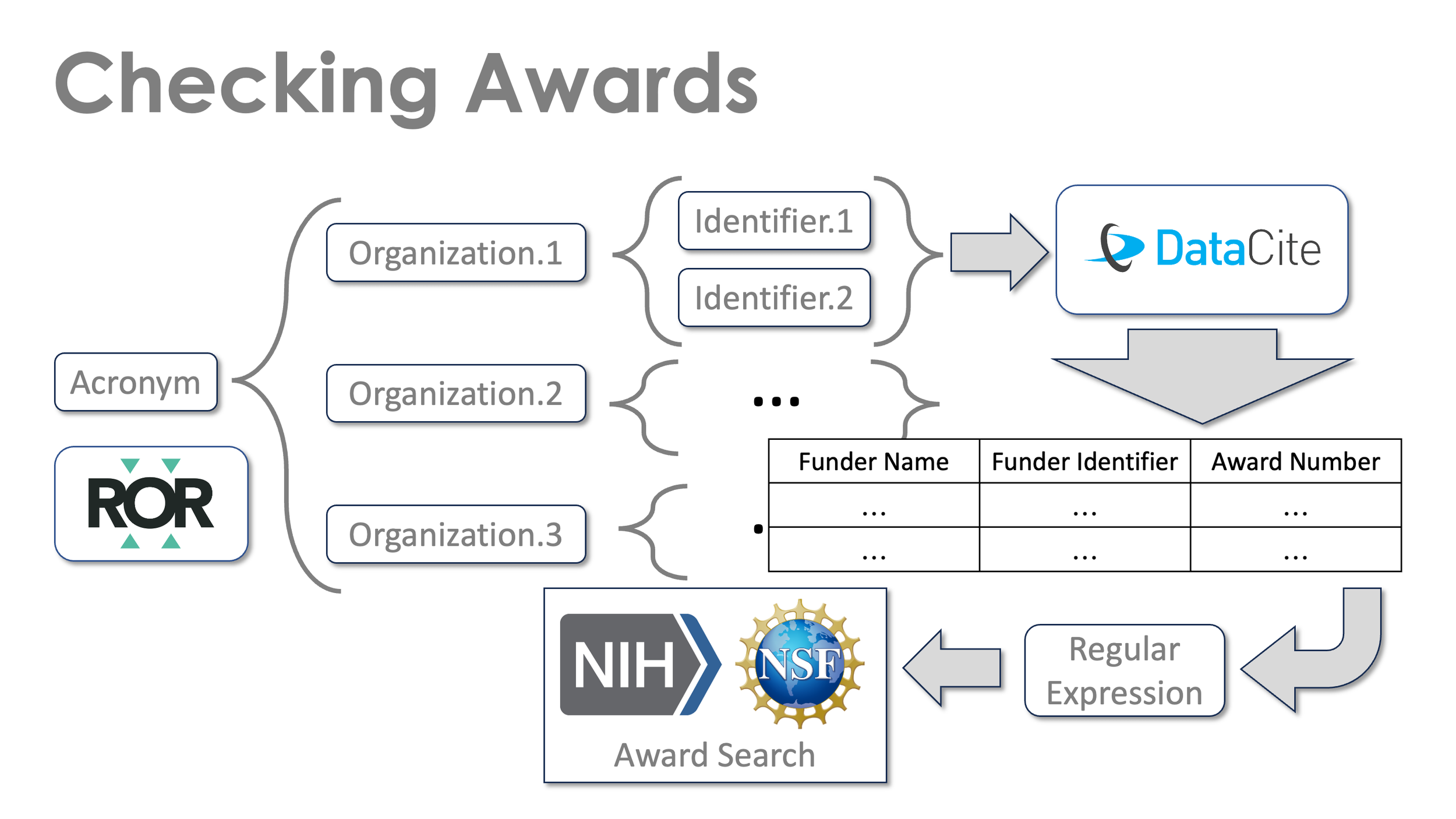 Figure 1 outlines a method that integrates metadata from three sources to use award numbers to check funder names and identifiers. The first step is to search the ROR data file for organizations with a given acronym. Three organizations share the acronym in the Figure 1 schematic.
