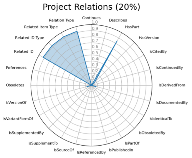 Keeping this in mind, repositories with high numbers in these use cases are good examples of the project description capabilities that the DataCite metadata schema offers. It is not surprising, therefore, that the highest utilization of the schema comes from a project record developed by DataCite for the FAIR Workflows Project.